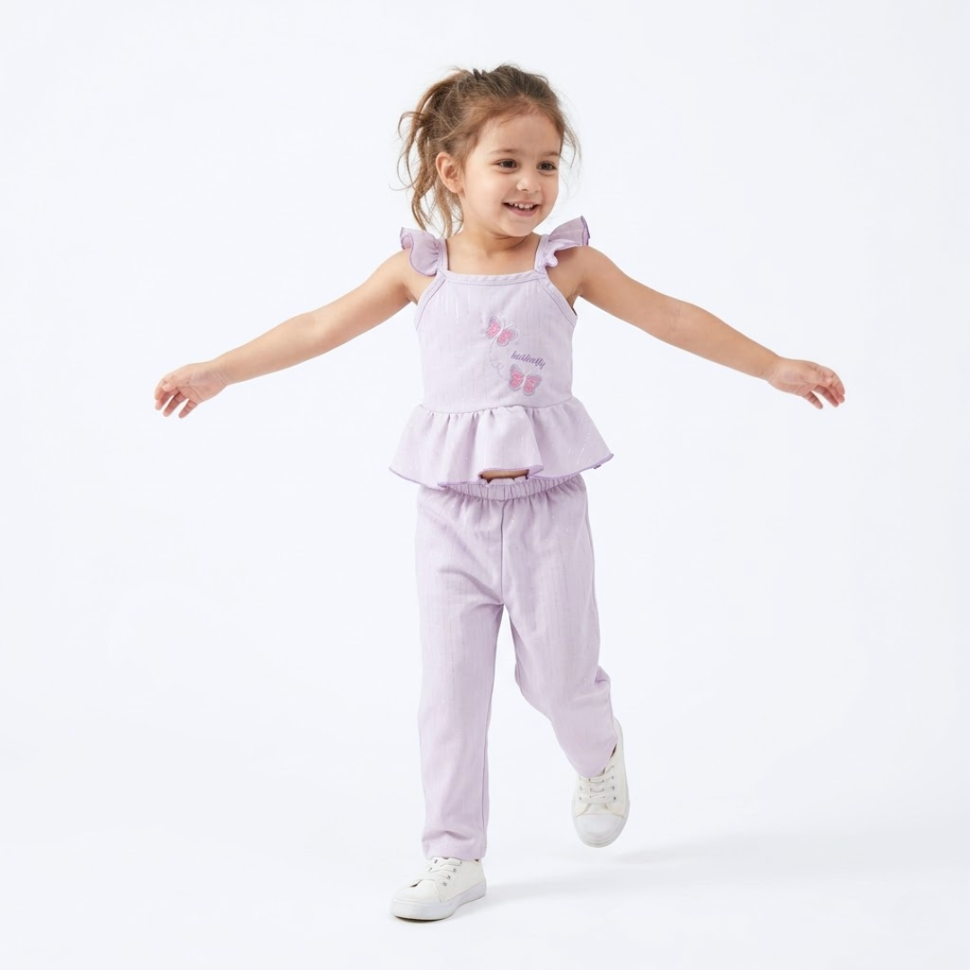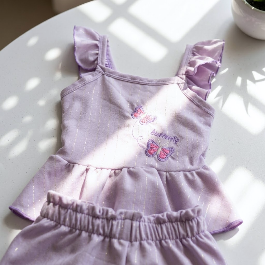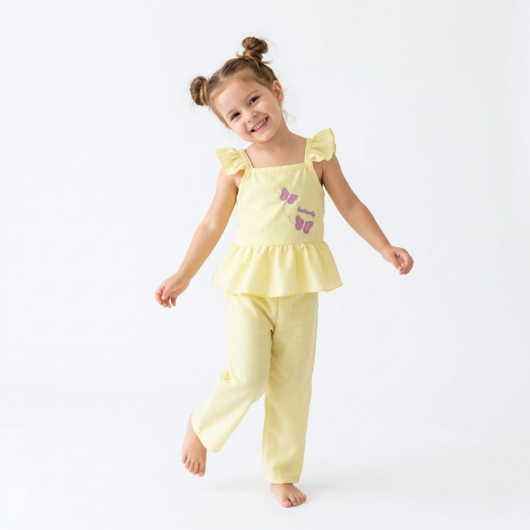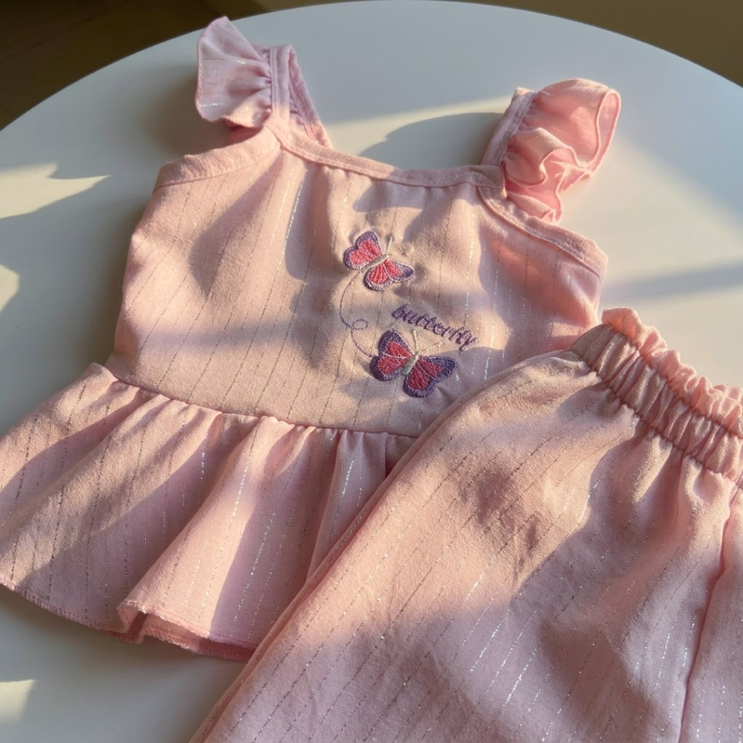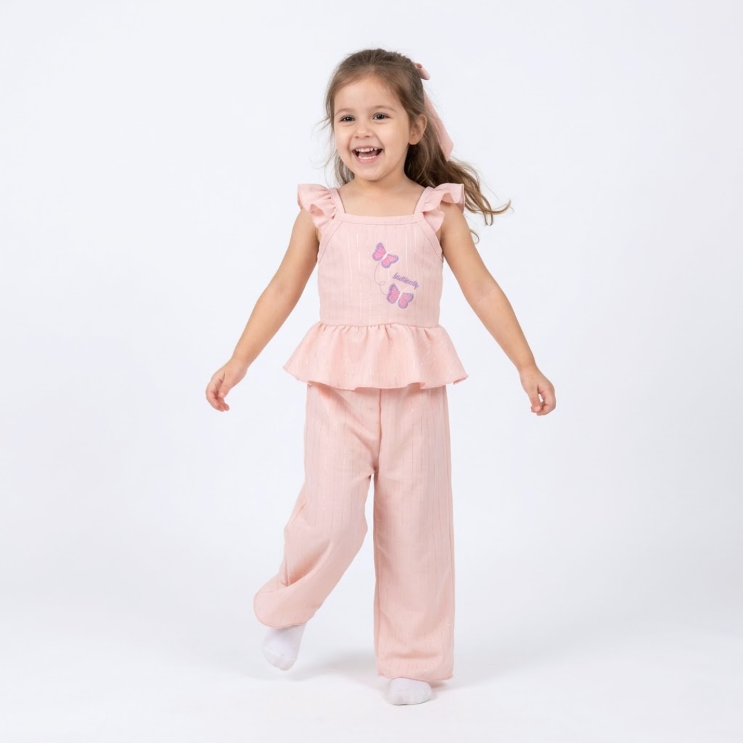 Déjate enamorar por la frescura y dulzura del conjunto “Butterfly”, un diseño pensado para acompañar cada movimiento con estilo y comodidad. Este hermoso set incluye blusa con olanes y pantalón ligero, decorado con delicados detalles de mariposas que le dan un toque tierno y encantador.